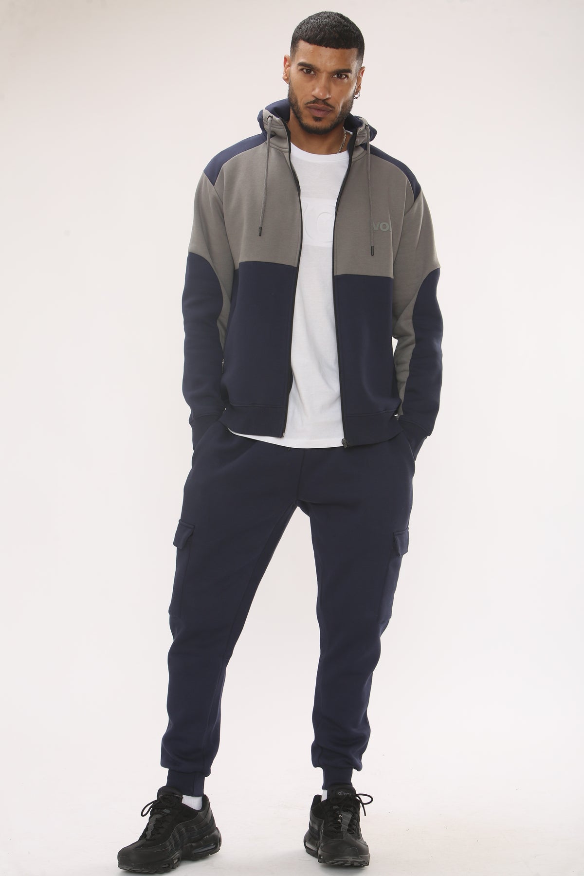 Meet the new go-to casual uniform. Combining modern utility with soft, fleece comfort, this men's tracksuit set is engineered for seamless movement and everyday versatility. The set includes a zipped hoodie and cargo performance joggers in a multicolour panel design, perfect for any activity from training to relaxing.